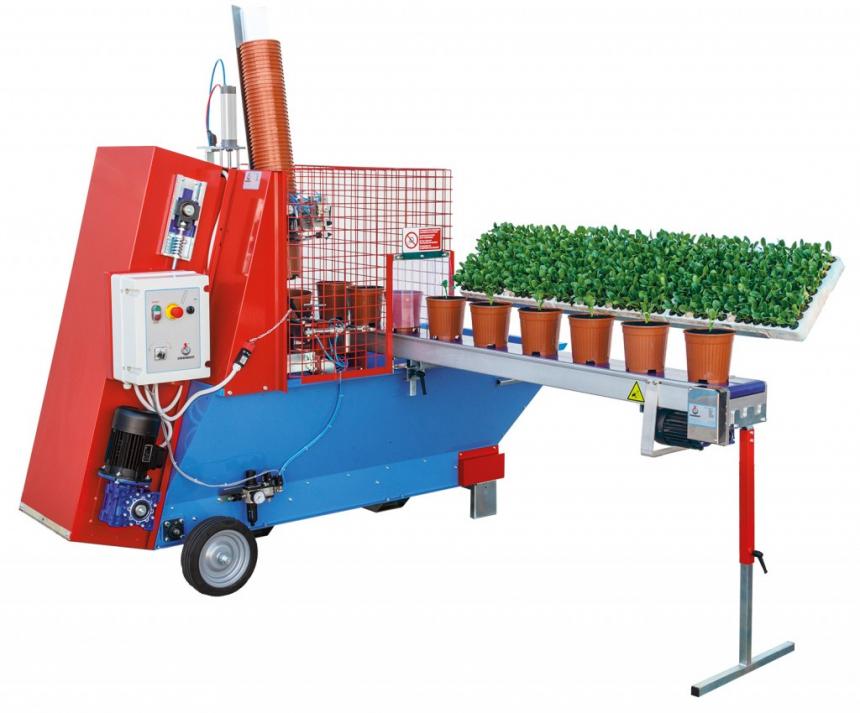 Автоматическая машина по наполнению горшков диаметром от 8 до 22 мм. Транспортёр движется в 1 сторону. Машина оснащена централизованной настройкой, колёсами для перемещения. Объём бункера - 800 л. Производительность - до 2400 горшков в час. Электропневматический податчик с устройством для квадратных горшков, буровой механизм и выталкивающая горшки ручка. Лункокопатель, рычаг смещения горшков на транспортёр, транспортёр для пикировочной линии длинной 2600 мм с держателем кассет. К дополнительным опциям можно отнести поворотный стол для сбора горшков (диаметром 1000 мм), механический посевной аппарат для ароматических растений, дозатор удобрений.Короткая информация